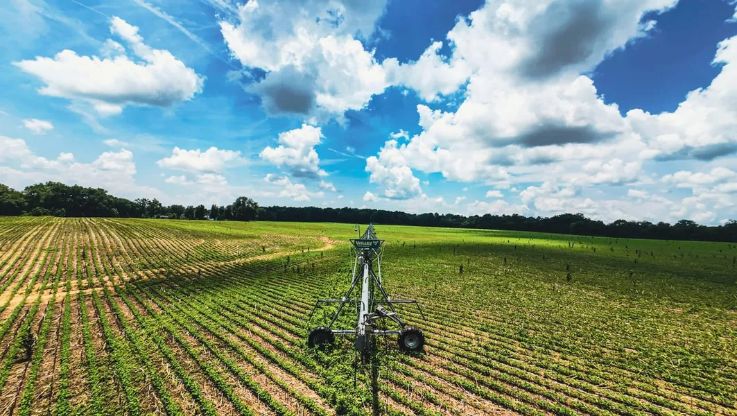 Twin irrigation pivots powered by Liberty Creek, ensuring year-round crop support