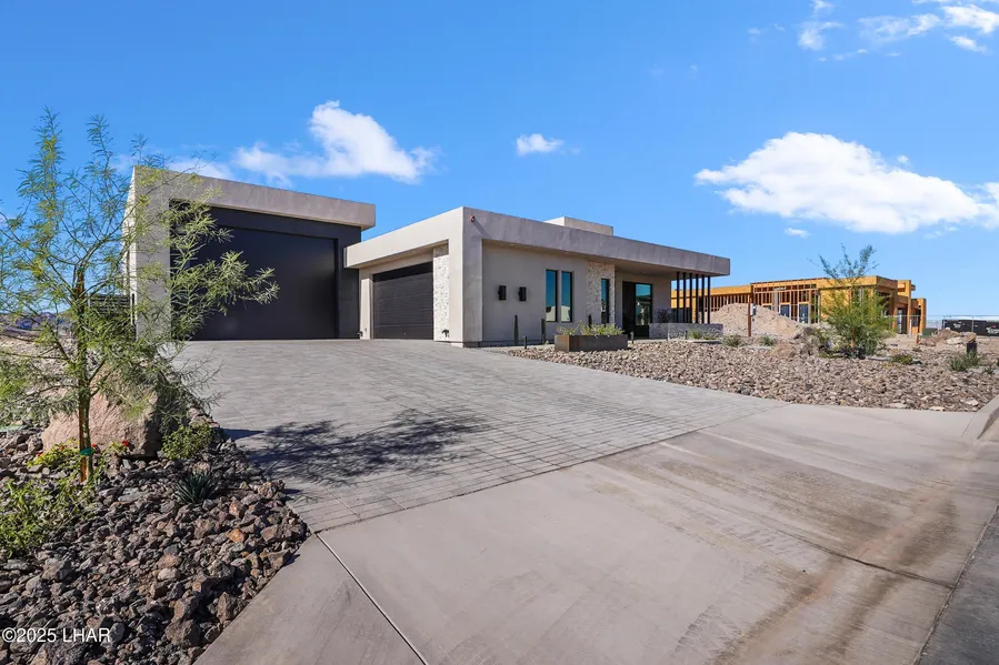 Modern elegance at Riviera Lake Havasu built by BH Development with interiors by Jennifer Hayek, this stunning residence boasts 3,443 sq ft of living space and 2,800 sq ft of garage for all of your desert toys. Sleep, modern design with refined finishes, this home has sweeping views of both the lake and surrounding mountains. Offering 4 bedrooms and 4.5 bathrooms, including a private attached casita, this home is built for both luxury and comfort. The open-concept layout flows seamlessly to the pool and spa, surrounded by natural desert landscape inspired by the Riviera environment. The resident is finished with limestone exterior accents, stucco, designer tile interior accents throughout, Taj Mahal countertops, European-style cabinetry with Emtek hardware, and high-end appliances including an 8-burner Wolf range and Sub-Zero refrigerator. Next to the pool and spa, you'll find a custom BBQ and large covered patios perfect for entertaining - all with a view of the lake. Enter through the large 5' x 10' Western pivot door and look through the expansive rear door systems to the lake. The home also features an Infiniti fireplace and is pre-wired for smart home, audio and a a surveillance system. For vehicle and toy storage, the home includes a 58.8-foot-deep RV garage as well as a spacious 2-car garage. This home is a rare combination of high-end craftsmanship, thoughtful design, and prime positioning within Lake Havasu's most exclusive community just minutes by golf cart from the Havasu Riviera Marina.