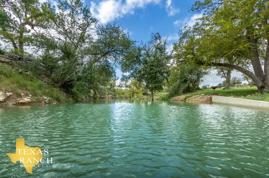 The property features 3,900 ft of a spring-fed creek which branches off of Koch Branch Creek. A portion of the creek is complemented with a concrete dam creating a pond and a concrete low water crossing across the creek. Additionally, there is a small pond on the ranch, a 300 ft deep electric water well and a concrete water trough.
