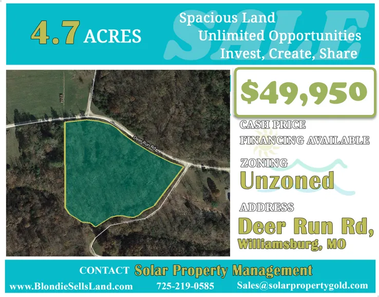 The lot sits on the unpaved Deer Run road. You can use these coordinates to find the property via Google maps: 38.827053, -91.750096 or the neighbors address of 9768 Deer Run Rd, which is across Sycamore street. While the property is Unzoned, there are Limited POA Restrictions. Build a Shouse, Tiny home, Cabin or place a Mobile / Manufactured house. Tent & RV camping are also allowed . Electricity is available at the street. Public / County connections are available for water, but a private septic system must be installed. Buyer must verify & work with County to know what can & can't be done with the land, obtain proper permits if needed & confirm the availability of any utilities needed/serviced on the lots. Seller makes no warranties or representations about the land, its condition, or what can be built on the parcel.