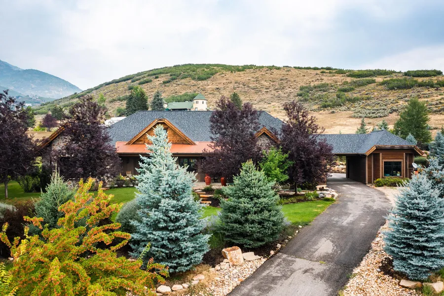 Delightful 4800 square foot Midway Masterpiece! 4 ensuite bedrooms and 6 total bathrooms and the Grandmaster sports a cozy fireplace and has a huge custom designed walk in closet and euro shower! Gourmet Kitchen with 6 burner gas stove, butler pantry and gorgeous natural stone countertops. Huge covered deck with party lights, fireplace, double sinks, huge walk-in. Home is sold furnished, south facing, 1 acre lot with 100 trees! 3 fireplaces, cabana, or 3rd car garage. Porte-cochere, copper gutters, waterfall and recirculating pond. Three complete heating and air conditioning systems, double sliding doors to bring the outside indoors, all hard surface and ceramic floors are heated. Basement is unfinished but awesome storage, formal dining and island and breakfast dinning.