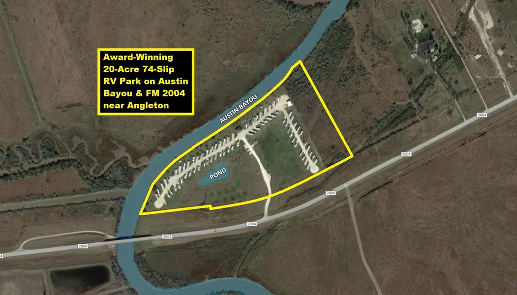Great Rental Income Property. Award-Winning 20-Acre 74-Slip RV Park on Austin Bayou & FM 2004 near Angleton. 27 Waterfront RV Slips & 47 RV Slips with Full 30/50 amp Hook Ups. 589 sqft Office Building w/Laundry Facility, Restrooms, Showers, Attached 868 sqft Covered Wood Deck. 30'x40' Maintenance Barn. Picnic Tables. Fishing Pond. 280 sqft Canopy Roof on Concrete Pad. Playground w/Swings. 12 Light Poles. ~1894' FM 2004 Road Frontage. 1925' Austin Bayou Frontage. Plenty of Room for Expansion. Recognized as Best in Angleton in the Best Recreation Camps Category in 2013. Park has Big Rig Access. WiFi Available. Across the Road from Brazoria National Wildlife Refuge (44,414-acre wildlife conservation area along the coast). Minutes to Bastrop Bayou & Chocolate Bayou. 15 Miles to Freeport Plants. Easy Access to Gulf & Surfside Beach 18 Miles Away. Great Fishing from Private Pond or Austin Bayou. Boats Allowed in Austin Bayou.