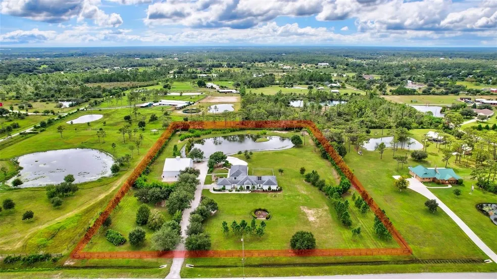 Under contract-accepting backup offers. One or more photo(s) has been virtually staged. This 6-acre estate is more than just a house; it's an invitation to a life with privacy, rural enjoyment and Florida southern peace of mind. The grand oak trees that line the driveway lead you into the property and a world of serene beauty: a shimmering lake, property lined with clumping bamboo, land for pastures, planting or leaving as it is for the aesthetic appeal. The recently roofed homes open-concept layout invites the warmth of sunlight to dance across the Italian wood like tile floors, whole house impact windows, completely re-painted inside and out, raised floor boards and crown molding. The living room is larger and looks out in both directions to the amazing property. The kitchen, a culinary haven, boasts newly added sleek stainless-steel KitchenAid appliances, including a Fisher & Paykel induction stove/convection oven and commercial grade Viking hood, granite bullnose counters and sink. A butler's pantry added having refrigerator and coffee bar. All together the area beckons those with a passion for gourmet cooking. A lovely third bedroom with sink share bathroom. Dining space next to kitchen leads to a large flex room, second master or multi-purpose room for entertainment or second living area. Second expansive bathroom with sink, walk-in shower and artistic tile floor. The master's suite is a private retreat. It's recently added 1003 sq ft expansive dimensions, two walk-in closets, master bath adorned with luxurious Kohler Tea-for-Two bathtub, walk-in shower and all bathed in soft natural light. Mud room in the back with multi-access doorways including into the wide-ranging oversized two car garage. Additional remodeled garage offers a perfect space for gym, bedroom, or office allowing business outside of the main house. Wrapping most of the exterior is slate tiled sidewalks and patios for free movement. Outside, the estate offers endless possibilities for outdoor enthusiasts. The expansive grounds provide ample space for leisurely walks, picnics, or simply enjoying the tranquility of nature. The enclosed pole barn, a versatile space, can be adapted to suit a variety of needs, from housing recreational vehicles to serving as a workshop or equestrian facility. This estate is more than just a property; it's a lifestyle. Close to Lakewood Ranch and centrally located between St. Pete and Sarasota with the restaurants, shops and some of the best beaches on the Gulf Coast. A testament to the enduring appeal of the American dream.