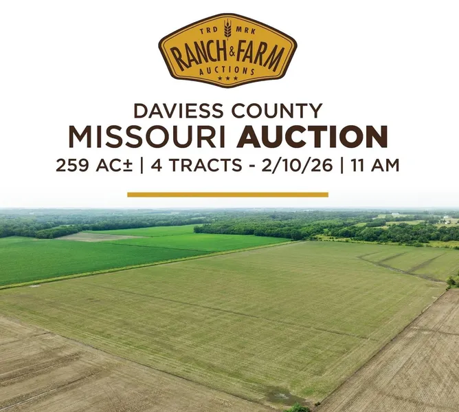 Auction Date: 02/10/2026 Auction Time: 11:00 AM CT Auction Held At: Daviess County Library, 306 W Grand St, Gallatin, MO 64640 Property Preview dates and times: TBD Live and Online at Ranchandfarmauctions website Entire Farm Description: The Clevenger Farms are a group of highly tillable farms with quality soils and proven results. 259± total acres available with just over 213 total acres for tillable income. Each farm has road frontage for access and is located less than 1 hour from Kansas City, Missouri. Any or all of these farms will make a great addition to your current operation. If you're looking for a solid investment with high cash rents, these farms are currently leased at $260/tillable acre. Farm Lease: The current farm lease may be continued by the new buyer or terminated at their discretion. If terminated, the buyer will only be responsible for reimbursing the tenant for any fertilizer or field work already applied. Tract 1 Description: 47.7± acres with 34± acres in tillable. Current cash rent is at $260/tillable acre, equaling $8840 annual income. Excellent Grand River bottomland soils with an NCCPI score of 70.9. Slope is 0-2%. Highway 13 and Highway 6 frontage for great access. Farm Lease: The current farm lease may be continued by the new buyer or terminated at their discretion. If terminated, the buyer will only be responsible for reimbursing the tenant for any fertilizer or field work already applied. Tract 2 Description: 85± acres with 74.28± acres in tillable. Current cash rent is $260/tillable acre, equaling an annual income of $19,312.80. Grand River bottomland soils with tillable acres averaging a NCCPI score of 72.9. Slope is 0-2%. Access is via county road, just under 3/4 mile off Highway 13 on the south end and 1/4 mile off Highway 13 on the north end. Farm Lease: The current farm lease may be continued by the new buyer or terminated at their discretion. If terminated, the buyer will only be responsible for reimbursing the tenant for any fertilizer or field work already applied. Tract 3 Description: 56.3± acres with 47.78± acres in tillable. Current cash rent is at $260/tillable acre, equaling $12,422.80 annual income. Highway 13 and Nickel Ave frontage. Beautiful lake on the property. Farm Lease: The current farm lease may be continued by the new buyer or terminated at their discretion. If terminated, the buyer will only be responsible for reimbursing the tenant for any fertilizer or field work already applied. Tract 4 Description: 70± acres with 53 acres in tillable. Current cash rent for $260/tillable acre equals $13,780 annual income. Soils carry a NCPPI score of 76.8. Big Muddy Creek travels along the eastern boundary. Access is off Midway Ave, 3/4 mile off Highway 13. Farm Lease: The current farm lease may be continued by the new buyer or terminated at their discretion. If terminated, the buyer will only be responsible for reimbursing the tenant for any fertilizer or field work already applied.
