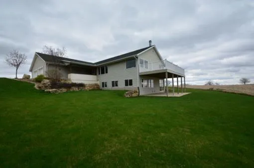 Located only a few miles west of Madison, WI in the hill country of SW Wisconsin in this custom built ranch home of approx. 4,000 sq. ft. on 26 acres. The 26 acres is part wooded with both hill, valley and fully stocked fish pond. The great room area is on the main floor and is 1,000 sq. ft. with stainless appliances, stone floor, hickory breakfast bar & built in buffet and booth, large stone fireplace, widow seats with storage, large windows and patio door to 12 x32 deck overlooking the pond. Master has large walk-in closet, full bath and office area, second bedroom has custom built king size bed and east facing window. Laundry/pantry room is located between the master and the great room and has a guest bath with shower. Lower level has a large family room, 2 bedrooms and an exercise room and lots of storage.. Oversized two car garage. All furniture, appliances and window covers are included. 48043-43705