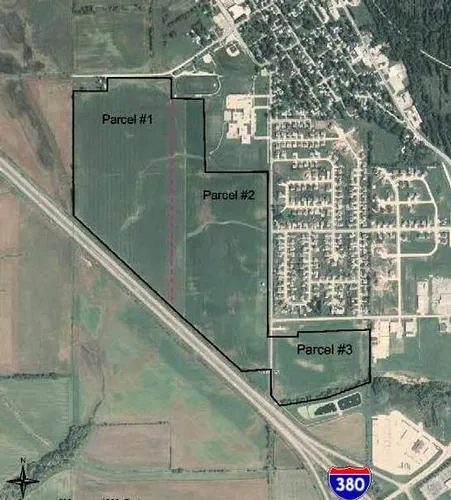 Auction, 6/9/11 at 10 a.m. Sale will be held at the LJL Hall, 908 Main Street, Center Point, Iowa. There are three parcels of land totaling 178 acres to be sold. Parcel #3, 26 acres, m/l. Located on the west side of Center Point in the City Limits. CSR of 71.2 on 23.6 cropland acres. FSA information for the entire 178 acre farm -- Cropland is 172.1 acres, Corn Base is 135.8 acres, Direct and Counter Cyclical Corn Yield is 124/124 Bushels/Acre, Soybean Base is 33.6 acres, Direct and Counter Cyclical Soybean Yield is 34/34 Bushels/Acre. This is a high quality Linn County farm located in across the road from the High School and adjoins the Elementary School. This farm is ideally setup for residential and commercial development as sewer and water already crosses through this farm. Residential development is across the road and there is excellent visibility to Interstate 380.