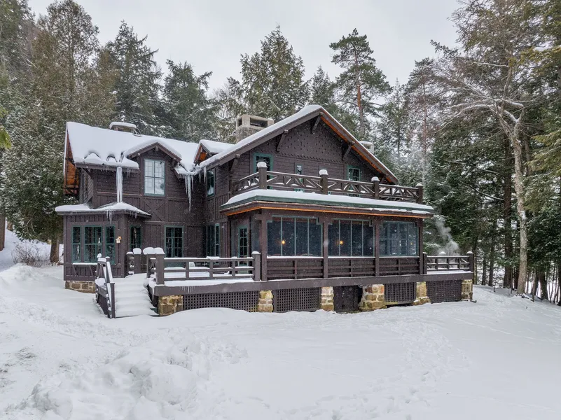 Introducing the enchanting Camp Tikkitibu, an Adirondack Great Camp steeped in history and charm. Built in 1906 for whiskey baron Henry Levy and designed by the celebrated artist and architect Julian Clarence Levi, this extraordinary property offers a rare glimpse into the timeless elegance of the Adirondacks. Nestled at the end of a private road, Camp Tikkitibu spans over 28 wooded acres with 500 feet of serene waterfront on Tupper Lake. The property showcases impeccable craftsmanship, featuring well-preserved wood, metal, and stonework that exude quintessential Adirondack character. The four-season main lodge boasts 4 bedrooms, 2.5 baths, and thoughtfully designed living, dining, study, and porch spaces—all with stunning lake views. Nearly every room can be warmed by its own fireplace, with the living room's grand stone hearth serving as a captivating centerpiece. Complementing the main lodge is a delightful summer Bunkhouse offering 4 bedrooms, a full bath, and three season living thanks to a cozy woodstove. The exquisite Birch Cabin, a true artisan masterpiece, sits peacefully by the lake, adorned with handcrafted birch details. It includes a full bath and a charming fireplace, making it a retreat within the retreat. The striking 2-slip boathouse features a large dock and is set on a solid concrete foundation. The boathouse is the ultimate summer gathering spot, featuring a changing room, a spacious game room with a balcony overlooking the lake, and plenty of space for lakeside entertainment. Conveniently located just 30 minutes from Adirondack Regional Airport, with daily flights from JFK and BOS, Camp Tikkitibu offers easy access to all the Adirondacks have to offer. Experience the unmatched beauty and history of this remarkable estate while creating memories to last a lifetime.