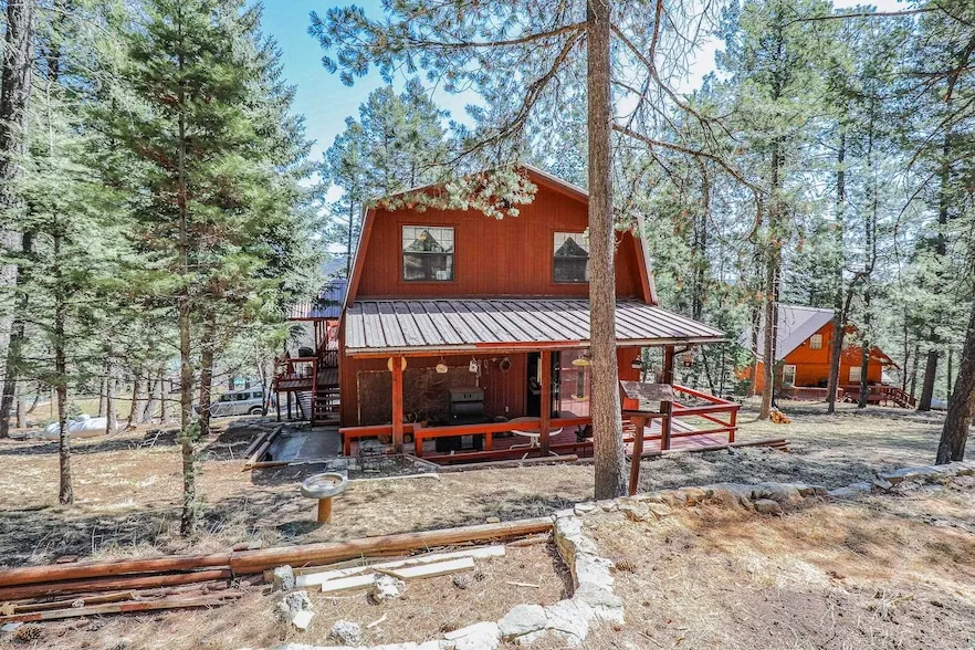 Mountain Retreat in Cloud Country Estates 3 Bed, 2 Bath Cabin on 1 Acre. Escape to the mountains with this stunning 3-bedroom, 2-bathroom cabin nestled on a full acre in the exclusive and gated Cloud Country Estates subdivision. This beautifully crafted home offers the ultimate mountain living experience with serene surroundings and upscale community amenities. Step inside to a soaring great room with wood beam accents, sleek ceiling fans, and a dramatic floor-to-ceiling wall of windows that fills the space with natural light and showcases tranquil forest views. Gather around the cozy wood stove or enjoy the open-concept layout that seamlessly connects the kitchen, living, and dining areas perfect for entertaining or family time. The primary suite is conveniently located on the main floor and features a spacious ensuite bathroom with dual-sink vanity and walk-in shower, as well as private access to the deck for quiet mornings with coffee or evening stargazing. Upstairs, you ll find two additional bedrooms, a full bathroom, and a versatile open loft area that could serve as an office, second living room, or extra sleeping space. Downstairs, a basement area offers flexible space for a workshop, storage, hobbies, or even a home office. Enjoy the large elevated deck, perfect for watching area wildlife or simply soaking in the peaceful mountain air. A long paved driveway and carport make for easy access year-round. This property includes an additional lot behind the home, offering added privacy and space. Located just 20 minutes east of the Village of Cloudcroft, the community also features a clubhouse and pool for residents. Whether you're looking for a full-time mountain home or a weekend escape, this cabin delivers rustic charm with modern comfort in one of the area's most desirable communities.
