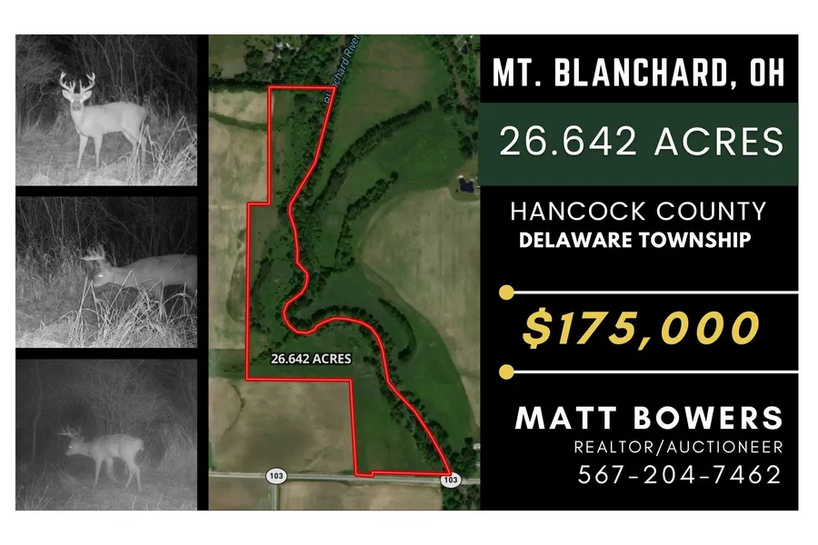 This 26.642 acre recreational honey hole boasts all kinds of wildlife! Whether hunting trophy whitetails, squirrels, rabbit, or fishing; it truly has year round recreational use. The east boundary of the property has the Blanchard River that runs its entirety. The river serves as a travel corridor for deer as well as its abundant fishing opportunities. This is the type of habitat that holds mature deer! There are currently 23.61 acres in CRP and provides a return on your investment. Who wouldn't want a recreational property that pays!