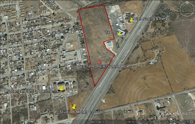 26.744 acre site for development on the north side of Interstate 20, within the city limits of Sweetwater, TX. Electricity and 6 city water main are on the property. A concrete driveway with culvert has already been developed from the access road onto the property. Excellent visibility with over 800' frontage on I-20 between Arizona & Alabama Avenues. Zoned for Central Business use. Potential uses include hotel, restaurant, retail, office, commercial, apartment and single family residential. Located in business corridor that includes Wal-Mart, Whataburger, a new Starbucks, Sutherlands, Tractor Supply, McDonalds, Aaron's Rental Center, Nolan Nursing & Rehab, Rolling Plains Memorial Hospital, Schlotzsky's Deli, Taco Bell, Southeast Elementary School, Studio 6 Motel, Mustang Heights Apartments, and much more!