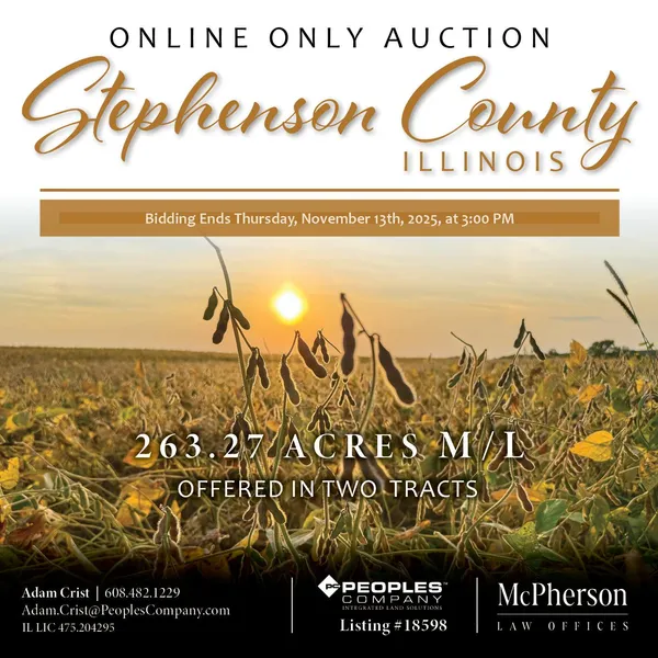 The auction will be conducted on the Peoples Company Bid Wrangler auction platform. The bidding is live and will conclude on Thursday, November 13th, 2025, at 3:00 P.M. CST. The two tracts will be sold on a price-per-acre basis. Take advantage of this opportunity to own a piece of prime Stephenson County farmland and scenic recreational land. Contact the listing agent for further details.