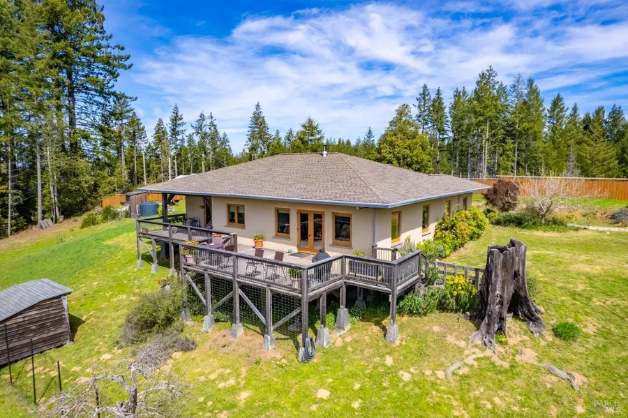 Nestled on 30 breathtaking acres of open meadows and towering Redwoods, this stunning custom-built 2bed/2bath home offers the perfect balance of privacy, natural beauty, and modern comforts. Built in 2008 with exquisite craftsmanship, this 1,922sqft home features rich mahogany & lacewood cabinetry, a thoughtfully designed floor plan, and elegant finishes that create a warm and inviting atmosphere. Set just inland enough, the property enjoys a perfect blend of warm sunshine and refreshing coastal air, making it an ideal environment for gardening or a potential vineyard weather and soil data available. The productive well, PG&E power with a backup generator, and spacious storage structures ensure convenience and self-sufficiency. Outdoors, take in the serene forest and meadow views from the Redwood deck, or harvest fresh produce from the vegetable garden and fruit trees. A 450sqft workshop provides ample space for projects, and a large storage structure adds even more versatility. Just a 14-min drive to Hwy 1 and the charming town of Albion, this exceptional property offers a rare opportunity to enjoy tranquil, country-living with easy access to the ocean and Mendocino Coast amenities. Don't miss your chance to own this stunning piece of California's North Coast paradise!