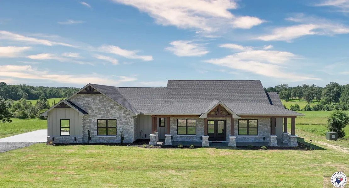 Stunning New Custom Home with Panoramic Views Just Outside City Limits. Nestled on 0.5 acres, this thoughtfully designed 4-bedroom, 2.5-bath stone/frame home offers over 2,400 square feet of refined living space. Enjoy breathtaking panoramic views and an ideal split floor plan that ensures both privacy and comfort. The open-concept living area features soaring ceilings, earth-tone finishes, and a striking floor-to-ceiling stone fireplace with gas logs, creating a warm and inviting atmosphere. The gourmet kitchen is a chef's dream, showcasing custom cabinetry, a large center island, gas range, granite countertops, and an oversized walk-in pantry with built-in shelving. The primary suite includes an electric fireplace and a spa-like en suite bath with a tiled walk-in shower, soaking tub, dual vanities, and a large walk-in closet. Two secondary bedrooms are connected by a Jack-and-Jill bathroom, making it ideal for families or guests. Additional features include two tankless water heaters for continuous hot water, ambient can-style lighting throughout, and an abundance of natural light from large windows. Outside, you'll find a beautifully landscaped yard, an expansive front porch with wood and stone columns, and a covered back patio featuring another built-in electric fireplaceGoffering one of the most beautiful views East Texas has to offer! Enjoy the peaceful crossbreeze and stunning sunsets in this truly serene setting. The home also includes an aerobic septic system and a 2-car garage. This home is a must-see! Some photos have been virtually staged.