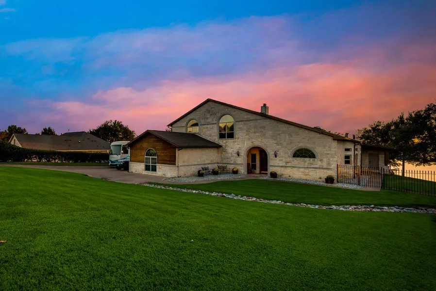 Luxury lakefront home with sunset views on a double lot with over 400 feet of waterfront! Recently completed remodel with soaring tinted windows, custom cabinetry with granite countertops including the boathouse. Gorgeous stonework seen throughout the home. Oversized Master suite includes hidden safe room, huge walk-in closets and fireplace. There is a built-in wet bar in upstairs game room and balcony overlooking the lake, screened-in outdoor kitchen and living area with fireplace. Rolling St. Augustine lawn to the wrought-iron fenced in private putting green, resort style pool, huge oak trees with wrap-around lounging decks and boathouse with jet ski and boat lifts all connected by meandering stone paths.