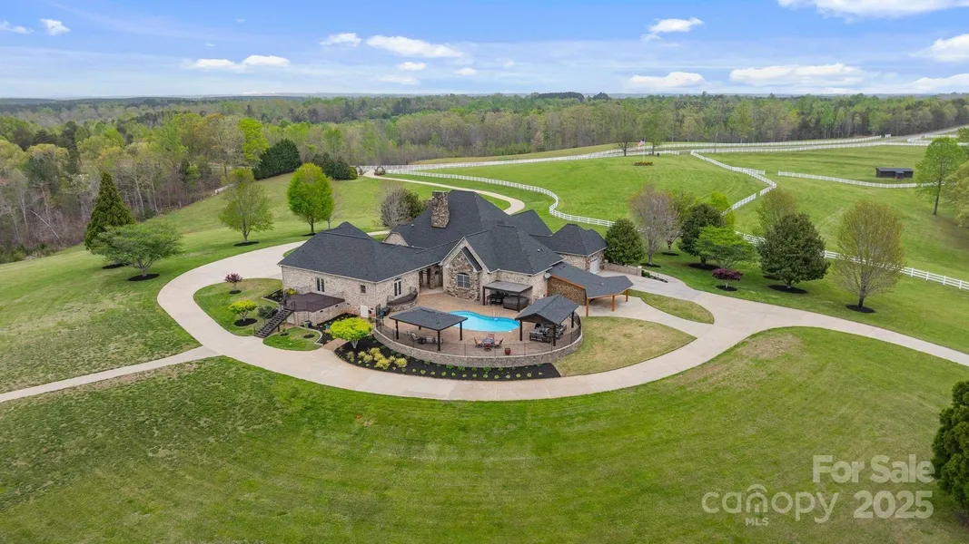 Nestled on 72+ acres of rolling pasture at the base of the Blue Ridge Mountains, this exceptional estate is a rare fusion of luxury, versatility, and breathtaking views. The primary residence offers 3,361 sqft of elegant living with three en-suite bedrooms, soaring 20 ft. ceilings, a gourmet kitchen, and a seamless connection to a private guest house via a charming breezeway. Designed for entertaining and lifestyle flexibility, the estate features a stunning pool, hot tub, 2 covered pavilions, and expansive terraces. Mulltiple guest cabins, and 16 bay vintage-style garage and motorcoach-ready storage building—convertible to equestrian use. A separate event center with ballroom, bar, prep kitchen and outdoor pavilion adds limitless possibilities. Above event center is another guest apartment/bridal suite. Whether you're a horse enthusiast, event host/entertainer, or car collector, this gated estate redefines private luxury living—just minutes from Tryon International Equestrian Center.