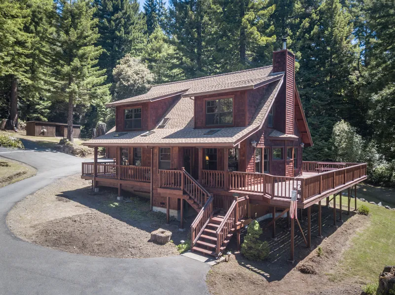 Sun Belt property with its own redwood forest and meadows. 12+/- acres with a 2 bedroom 2 bath custom redwood home plus office. Interior is beautiful wood and brick floors downstairs with open floor plan, open beam and wood throughout. Radiate in floor heat and wood stove offers warm and cozy nights in the winters. Hugh decks for entertaining or just enjoying the environment and sounds of nature. Property also offers a separate 1 bedroom guest house with laundry. Outbuildings for horses or animals on a mostly private road. Two wells with storage one dedicated to the home and the other solar powered for irrigation and more. Large garage for storage/wood shop if one chose. Most see to appreciate the craftsmanship and with wood that you can't find in todays market.