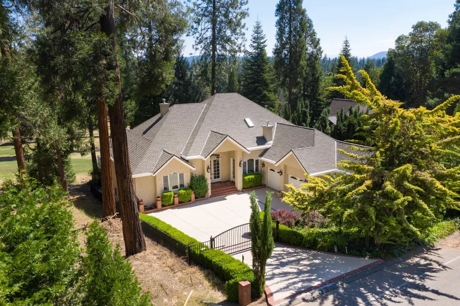 Exquisite executive home in exclusive golf course area in the lower Sierras. A gated entrance leads to the 4800sq ft luxury home. The main floor features a Double French door entry with soaring 12 ceiling & columns leading into a large open floor plan with living room, kitchen, dining room, & bar going out onto an expansive deck for entertaining, eating and even working. Imagine living & working in the foothills with an unobstructed view of mountains and golf course as your back yard. The grand living room features custom sliding doors for easy indoor/outdoor living, TV with surround sound, concrete gas fireplaces, 48 wide hallways throughout. The family chef will fall in love with the gourmet kitchen designed with entertaining in mind complete with natural stone flooring, over sized island w/sink, Second Island with bar sink & wine rack cabinets with custom wine carvings, top of the line appliances including inside gas BBQ & custom 54cabinetry. A nicely appointed dining room just off the kitchen with separate glass door to Deck with built-in BBQ for ease in cooking & serving. A gorgeous guest bath & large laundry room w/sink. Master suite on the main level has special views overlooking of golf course , deck, dual walk-in closets, spacious custom en-suite bathe, jetted tub, his/her sink areas. Down the stone stair well you will be greeted by a showpiece wine cellar, tasting room, bar with all the necessities including a 50lb ice maker. Two large bedroom suites situated on each end of large game room for privacy. All rooms have private entrance to patio & Gardens. The large game room is ideal space for hosting parties and includes an Antique Pot Belly Pool Table, TV with surround sound. This unique home is centrally located only 5min to Payless, hardware & other conveniences. See attached detailed home features by room. Turnkey available.