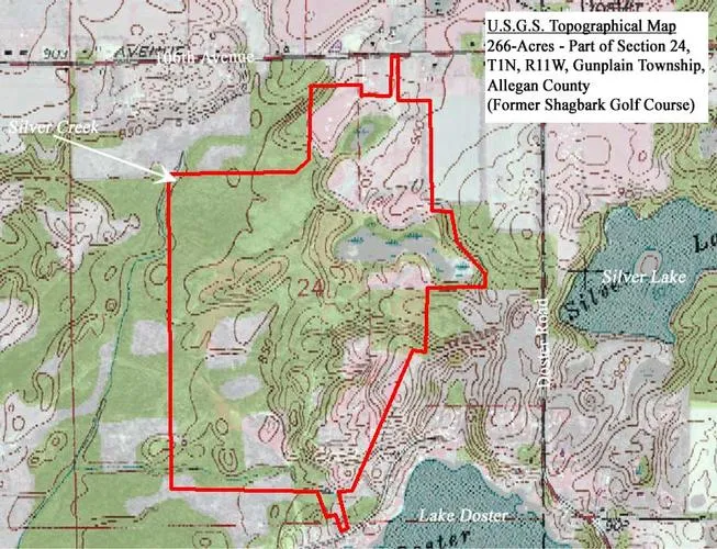 Wilderness Hills: This spectacular 266 acres is diverse terrain, including wooded, open meadows (some tillable), and a range of water features, including a pond, a stream, wetlands and access to all-sports Lake Doster. Located midway b/t Chicago and Detroit, and 30 minutes from Grand Rapids, it offers many possible uses, such as a private hunting lodge/retreat, equine center, and others. The property supports an excellent population of deer and turkey. The terrain is hilly and features the highest point in Allegan County. Numerous spectacular building sites with great vistas and panoramic views are available. A Town & Country log lodge features an open log beam ceiling, beautiful field stone fireplace, and full commercial kitchen. Very private, set back from the road, an asphalt driveway leads to a large lighted parking lot. The building has two levels, with a large wrap around deck, and offers beautiful panoramic views.