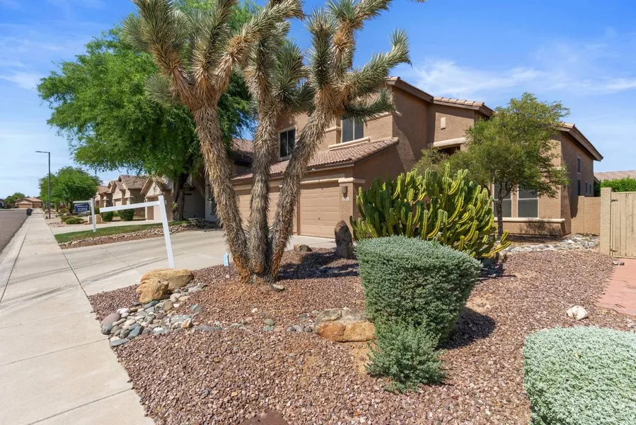 Home Sweet Home! This energy-efficient property features 2x6 construction, R38/R22 insulation, 12 SEER A/C, ceiling fans in every room, reverse osmosis, and a water softener. Owned solar panels and dual Tesla chargers offer huge energy savings and sustainable living. The spacious kitchen includes a large island, 42'' raised-panel cabinets, and tile flooring throughout walkways, kitchen, baths, and laundry. Brand new carpet on the staircase adds a fresh touch. A versatile downstairs room with French doors is perfect for an office or guest space. The backyard is a private oasis with a covered patio, resort-style play pool with water feature, and flagstone walkways.
