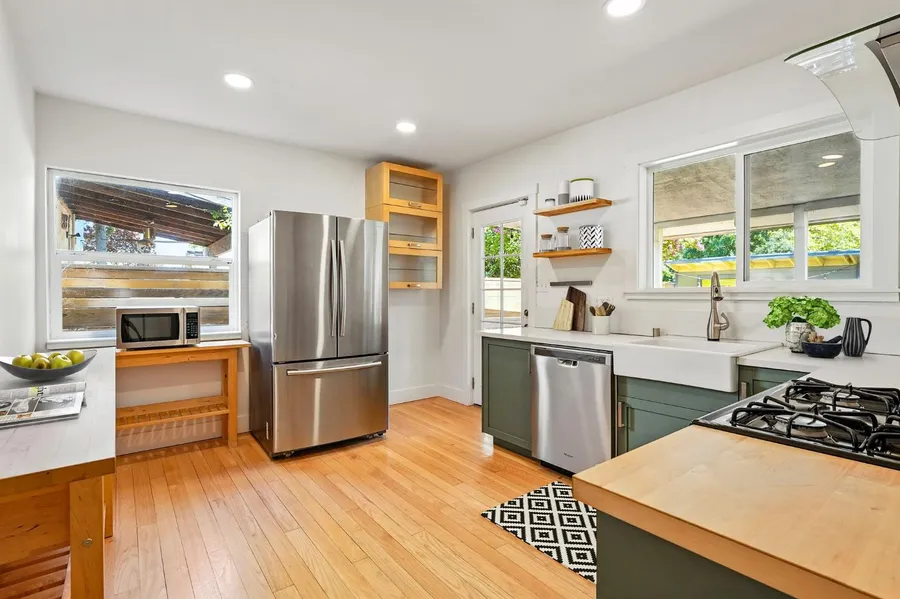 Charming Land Park Bungalow! Step into a spacious living room with coved ceilings and a cozy wood-burning fireplace. The updated kitchen offers modern conveniences; stainless steel appliances, open shelving, and a window overlooking the bright, private backyard. A sunlit dining room with a built-in hutch adds old world appeal. The home features a vintage-style bathroom with a pedestal sink and open shelving, dual-pane windows, ceiling fans, composite roof, one car attached garage and a Nest thermostat for easy remote control. Enjoy year-round outdoor living in the low-maintenance backyard with artificial turf, bistro lighting, and a covered porch. Newer modern wood fencing frames a versatile outbuilding perfect for an art studio, workshop, or gardening projects. Ring doorbell and all appliances included! Close to light rail, shopping, dining, schools, freeways, downtown and William Land Park!