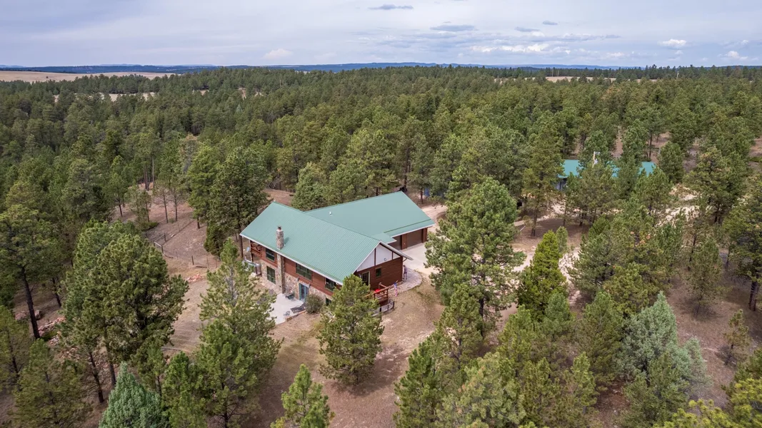 ***NEW LISTING*** BLACK HILLS HIDDEN GEM! A gracious, immaculate squared log home w/dovetail craftsmanship! This fantastic walkout ranch is perfectly set on 40 awe-inspiring, pine tree infused acres! Vaulted ceiling crowns the open, sun-drenched main living area. Custom wood surrounds the kitchen, boasting granite countertops & stainless-steel appliances! Large master suite hosts a private bathroom with dual vanity and walk-in shower. Step out to the covered deck and soak in the private views and peaceful setting! Convenient mud room laundry room on the main level. Well-thought-out foyer between the oversized attached 2-car garage and the living space. Walkout basement highlights a sprawling family room with cozy stone-encased wood-burning stove, kitchenette & access to an open 16x18 patio plus 2 bedrooms, one bath and an office! Expansive covered deck spans the length of the home, giving a front row seat to views on views on views! Wildlife abounds here too! There is a wonderful insulated and heated 36x60 metal shop building that sports an inside endless pool. It is perfectly set for all your outdoor toys! 12x16 shed offers even more storage options. Bring your horses as this has become a nice horse community and the 40 acres allow you lots of grazing and riding options. With a mix of open meadows and mature trees, the property offers privacy, serenity, and endless recreational opportunities right outside your door. Whether you dream of gardening, hiking your own land, or simply enjoying peaceful mornings on the deck, this property has it all. Come take a look and you just might finally say - HOME AT LAST!!!