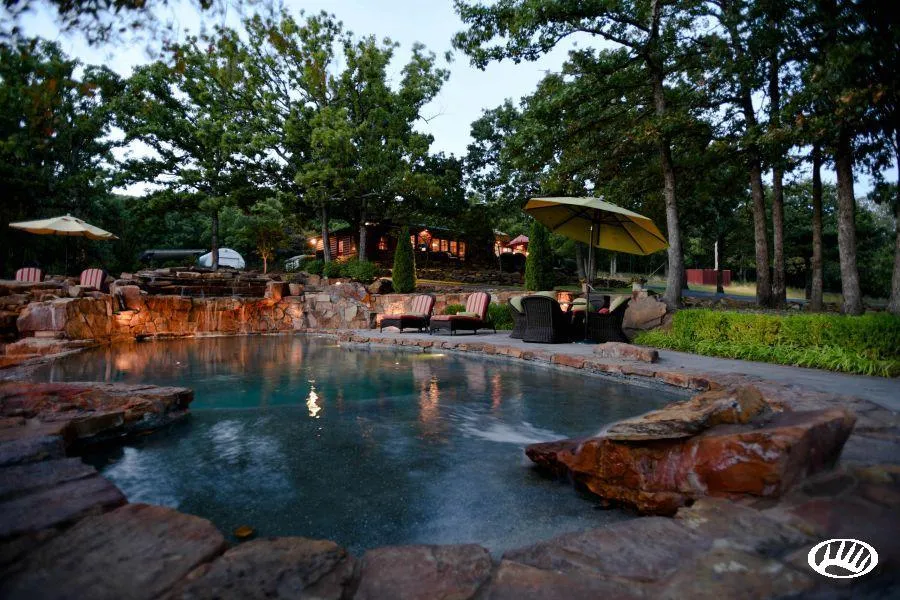 - 25’ by 25’ log pool house provides a bathroom, a bar, outdoor shower, and plenty of room for tables/couches