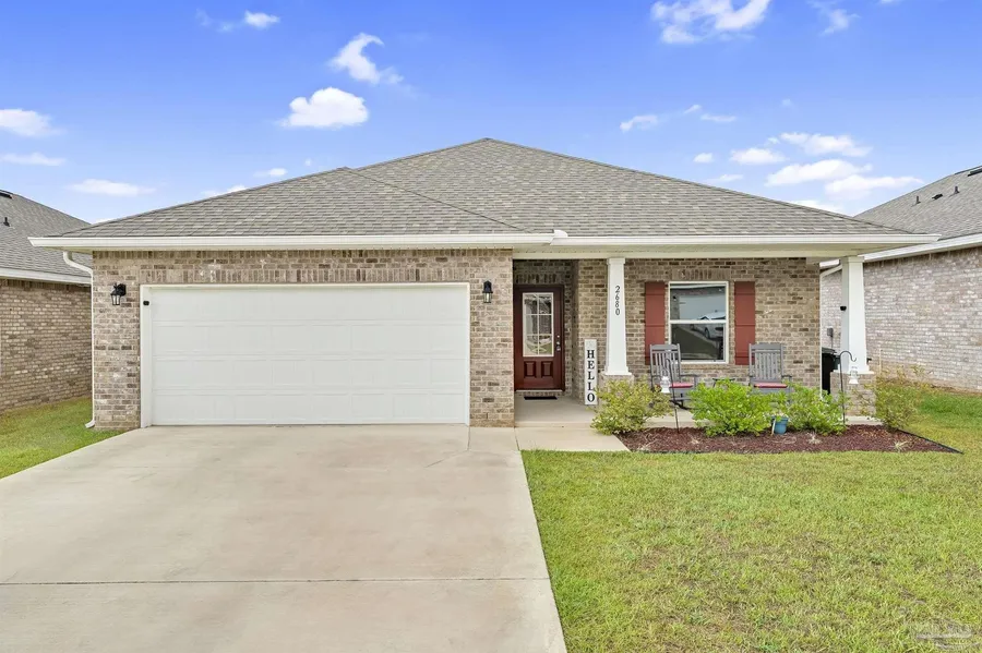 Welcome to this well-maintained 3 bedroom, 2 bath home with a 2-car garage and private pool. This property blends comfort and functionality with thoughtful design throughout. The exterior features four sides of brick, a welcoming front porch, and a backyard oasis with a pool that's perfect for relaxing or entertaining. Inside, you'll find 9-foot ceilings, with tray ceilings and crown molding enhancing both the family room and the primary suite. The open-concept layout creates a bright, spacious feel. The kitchen is equipped with stainless steel appliances, including a range, built-in microwave, and dishwasher. Flooring includes luxury vinyl plank throughout the main living areas and primary suite, with carpet only in the two guest bedrooms. Conveniently located near military bases, beaches, downtown Pensacola, and hospitals, this home offers easy access to everything the Gulf Coast has to offer. Don't miss your chance to make this move-in ready home with a pool yours-schedule your private tour today!