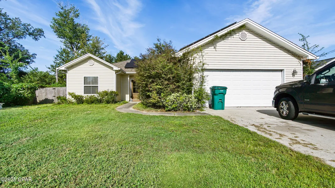 *CURRENTLY UNDER CONTRACT, SELLER WILL CONSIDER BACKUP OFFERS* Welcome to this well-maintained 3 bedroom, 2 bathroom home tucked away on a quiet road, only 15 minutes from Tyndall Air Force Base. Featuring a desirable split floor plan, this home offers both comfort and functionality. The interior showcases tile and laminate flooring, vaulted ceilings, and a well-appointed primary suite with a walk-in closet and ensuite bath. A bright and expansive kitchen provides extensive cabinet storage with a breakfast bar. Enjoy Florida living with a covered back porch overlooking the fully fenced backyard, perfect for entertaining, pets, or play. The insulated garage adds versatility, and the yard includes a sprinkler system for easy maintenance. The home also comes equipped with a washer and dryer for added convenience. One of the biggest highlights is that the home comes with fully paid-off solar panels, drastically reducing electric bills and adding long-term value. Whether you're looking for a primary residence or an investment property, this home is move-in ready and full of potential.