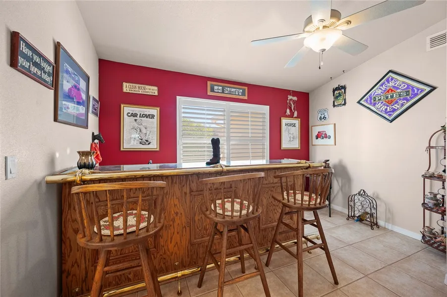 Wow, this incredible property truly has it all! Situated on just under a half-acre, this home offers beautiful mountain views, a sparkling pool with waterfall feature, relaxing spa, and solar heating for those perfect summer days. The large, covered patio includes a gas grill that stays, creating the ultimate space for entertaining. The backyard is enclosed with a block wall for privacy and includes a storage shed. For those needing extra space, there's an attached four-car garage plus a detached garage/shop totaling approximately 5,000 sq. ft. Both garages feature built-in shelving, and the detached garage includes 220 power and an air conditioning unit ideal for car enthusiasts or hobbyists. The exterior has been recently painted with elastomeric paint, and the property includes RV hookups, rain gutters, and extra concrete leading to the detached garage. Inside, you'll find a home that has been meticulously maintained. There's newer carpet in the bedrooms and tile flooring throughout the main living areas. Elegant white plantation shutters, a central vacuum system, and a cozy gas fireplace with mantel add comfort and charm. The kitchen is a showstopper with granite countertops, abundant cabinetry some with pull-out drawers stainless steel appliances including the refrigerator, and a movable island for extra workspace. A formal dining area currently used as a bar room features a solid wood built-in bar. The primary suite is spacious and includes a walk-in closet and ensuite with dual vanities, a jetted tub, and a walk-in shower. The split-bedroom layout offers additional privacy, and the utility room provides extra cabinetry, hanging space, and the washer and dryer are included. This well-maintained home is filled with thoughtful upgrades throughout an exceptional opportunity that combines comfort, functionality, and style.