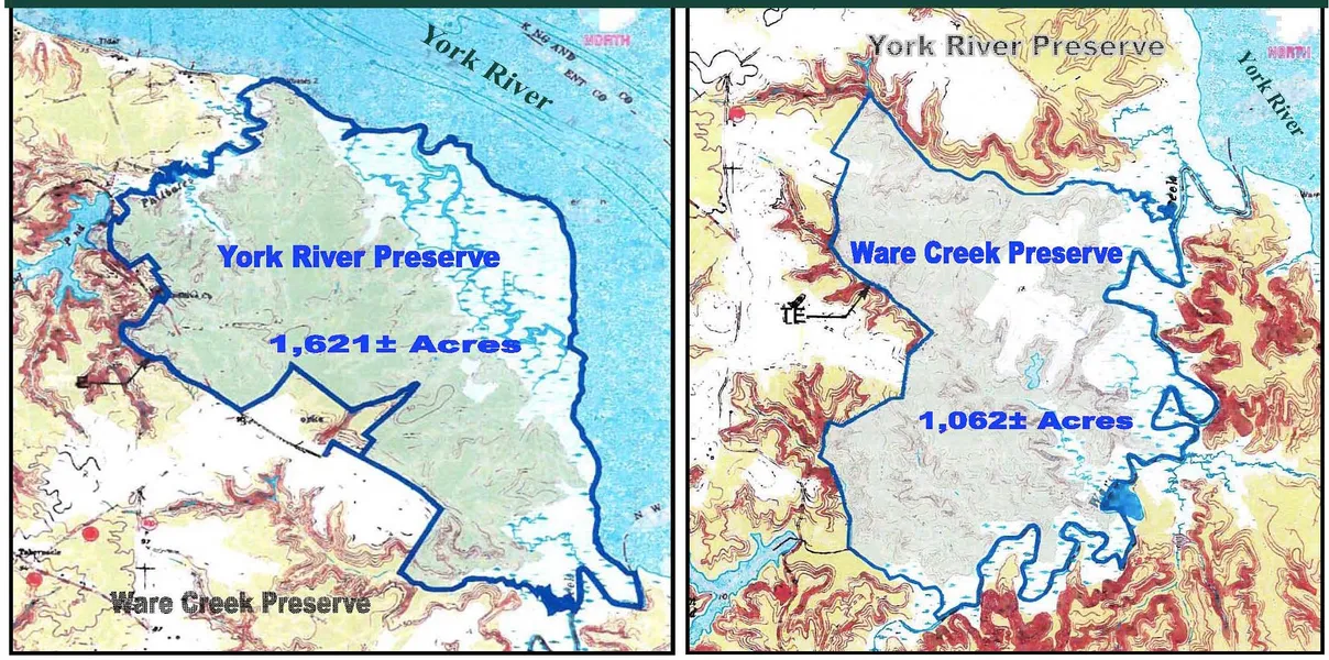 A total of 2,700 acres on the York River and Ware Creek near I-64, the York River State Park and Williamsburg, VA. Approximately 3 miles of friontage on the York River and a long Ware Creek frontage. There is timber, cropland, a lake, Marsh. PRICE REDUCED.
