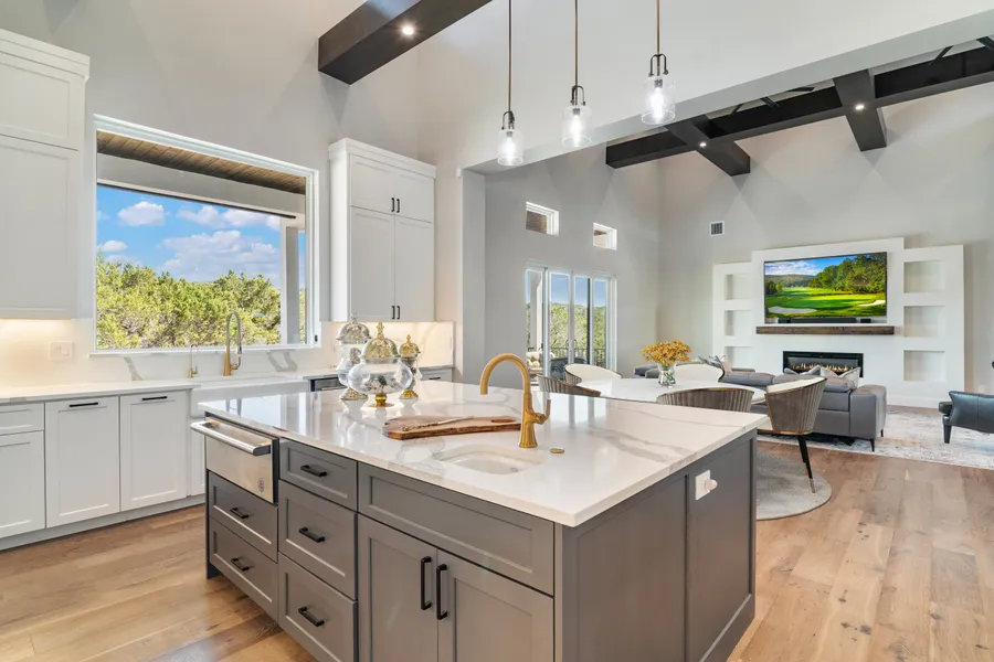 Breathtaking contemporary single-story with 4 beds, 3.5 baths, and 3873 sq ft situated on 1.44 acres in the coveted, gated subdivision of Ramble Ridge! Nestled amongst picturesque hills, the stately driveway leads you to the captivating front entrance. Upon entering, the 20ft high ceilings and custom beams commands your attention for the great room with fireplace and a wall of windows. The gourmet entertainer's kitchen is outfitted with Jenn Air appliances, stunning quartz countertops, designer fixtures, and soft-close cabinetry. No detail has been spared with the pantry that looks straight out of the Home Edit - with an on-trend custom paint, custom cabinetry. Don't miss the designer bar space, a great focal point off the kitchen. The flex space off the living room is used as a media room but can also be a formal dining space. The luxurious primary bedroom features scenic views with total privacy and connects to a spa-like ensuite with a large walk-in shower, dual water closets, a modern free-standing tub, and your dual dream closets! Off the primary suite wing, you will also find an additional space that can be used as a study, a nursery, or workout space. The secondary bedrooms have ensuite baths and high ceilings. Storage space abounds with an expansive laundry room and spacious 3 car garage with electric vehicle charging outlet, cabinetry, and a sports storage wall. Enjoy the Texas Hill Country evenings on the grand back patio, perfect for relaxing and entertaining! With a ranch behind your lot, you have unmatched privacy and views!! Dual Solaris units for indoor air quality; new water softener & osmosis system; Comal ISD. Welcome home!