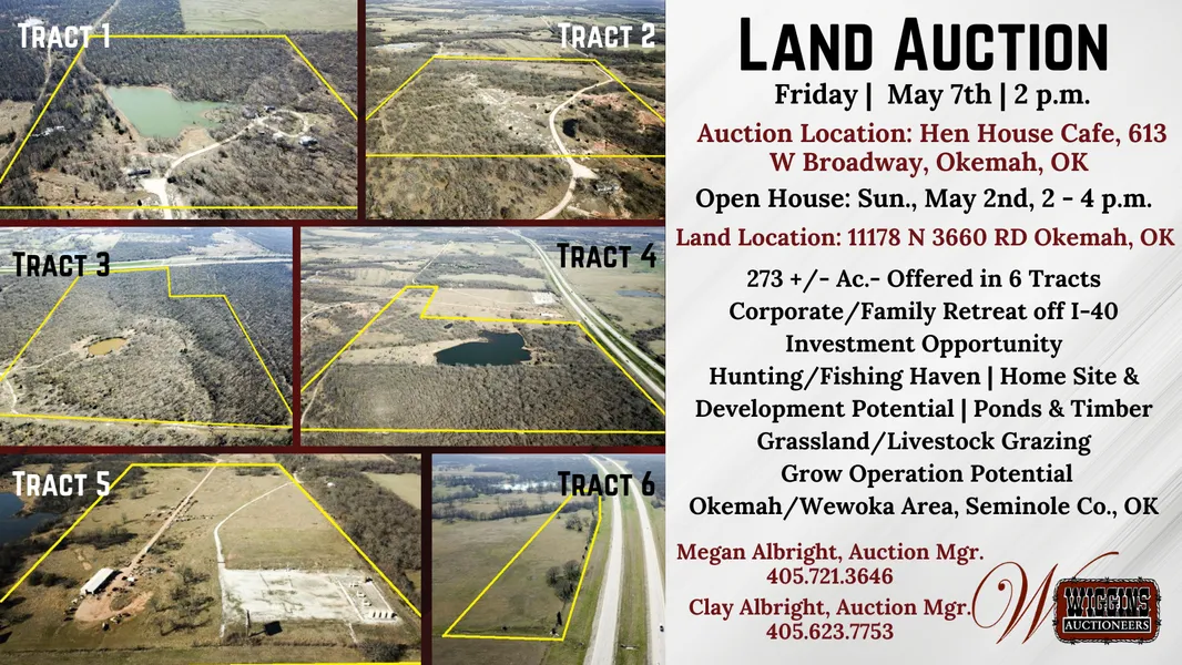 Land Location: 11178 N 3660 RD Okemah, Oklahoma OR From the Jct. of I-40 & OK-56, 1/2 mile N. on OK-56 to EW112 Rd., then 2 miles W. on EW112 Rd. OR From the Jct. of OK-56 & OK-48, 5.4 miles W. on OK-56 to EW112 RD., then 2 miles W. on EW112 RD.