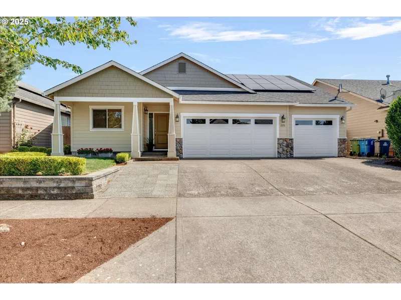 Price Reduced!! Charming one-level home in Hubbard featuring 3 bedrooms and 2 bathrooms. The open floor plan is highlighted by vaulted ceilings in the living room, a cozy gas fireplace, and abundant natural light. The bright kitchen flows seamlessly into the dining area, complete with built-ins for added storage. The spacious primary suite includes a large walk-in closet, offering both comfort and convenience. Step outside to a beautifully landscaped backyard with a patio—ideal for relaxing or entertaining. Enjoy low utility costs with an owned solar system. A three-car garage and ample parking provide plenty of space, all located on a quiet street.