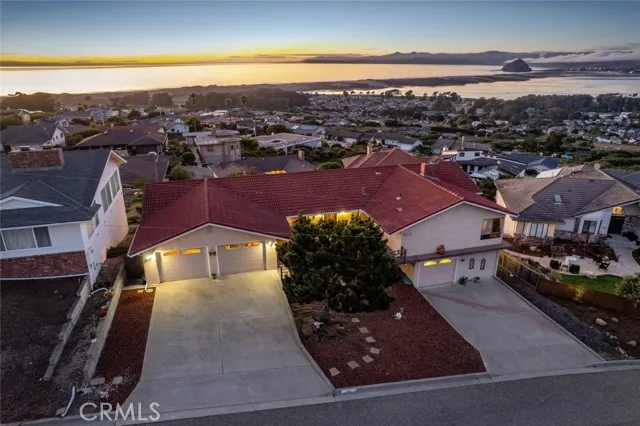 The home boasts 180-degree views of the back bay, Morro Rock, and the Pacific Ocean. Its dynamic split-level design provides a multitude of options, including multi-generational living, private guest quarters, or a rental option with a dedicated two-car garage. The expansive lot also offers endless possibilities for customization and enjoyment.