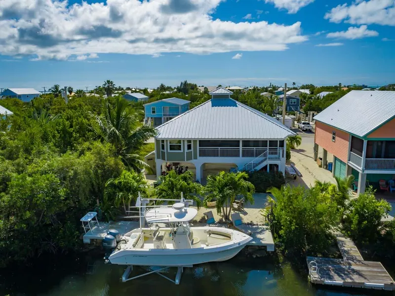 New construction with a modern coastal flare featuring all the finest finishes and details throughout! Concrete stilted home built in 2019 with all impact windows & doors and metal roof - low insurances! Stunning open floorplan with cathedral ceilings, marble flooring, and smart lighting throughout the home. Dream kitchen with custom cabinetry, quartzite counters, top of the line appliances, and a huge island with seating and storage. Three spacious bedrooms and two baths featuring marble vanities and fine fixtures. Cat V and HDMI wiring in the walls. Screened in balcony overlooking the canal with beautiful travertine tile. Backyard oasis offering lush tropical landscape, 40 ft. concrete dock, 16K lb. boat lift. Great access to the turquoise ocean waters for world class fishing and diving!