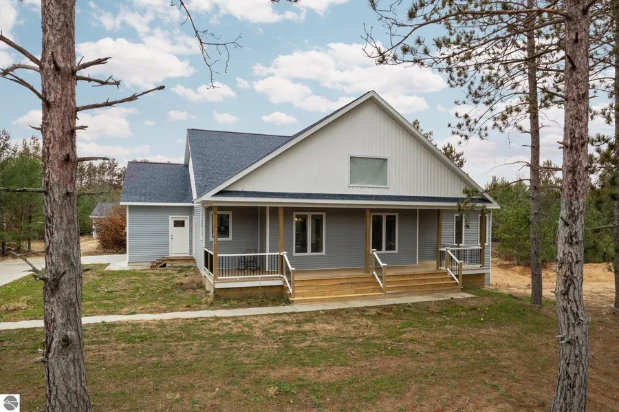 Discover this newly built ranch home on 2.56 acres set upon a peaceful cul-de-sac that abuts state land, complete with a fully finished 908 sq ft accessory building featuring 1 bed/1.5 baths, a full sized kitchen, and a 1-car attached garage—perfect for a home office, studio, or creative retreat. Inside the main home, the spacious layout is filled with natural light, featuring an open floor plan, cathedral ceiling, and an island kitchen with granite countertops and stainless steel appliances. The private primary suite boasts a massive walk-in closet and spa-like bath, while two bright and airy guest bedrooms provide plenty of additional space. Other highlights include main-floor laundry, a mudroom with a half-bath, and a walkout lower level for even more flexibility. Enjoy the covered front porch or the back deck, both excellent spots to soak in the serene natural surroundings. Located in the sought-after Kingsley school district, known for its excellent education system, this property offers convenience to Traverse City, Kingsley amenities, direct access to state land, East Creek Reserve, hiking trails, snowmobile trails, and more. A perfect blend of modern comfort and outdoor adventure awaits!