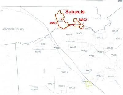 "MA01" bordering the north side of Bedias Creek south of FM 1428 between I-45 and FM 247 about 90 miles north of downtown Houston, Texas. "MA02" borders the north side of Bedias Creek and the west side of FM 247 between Huntsville and Madisonville, Texas