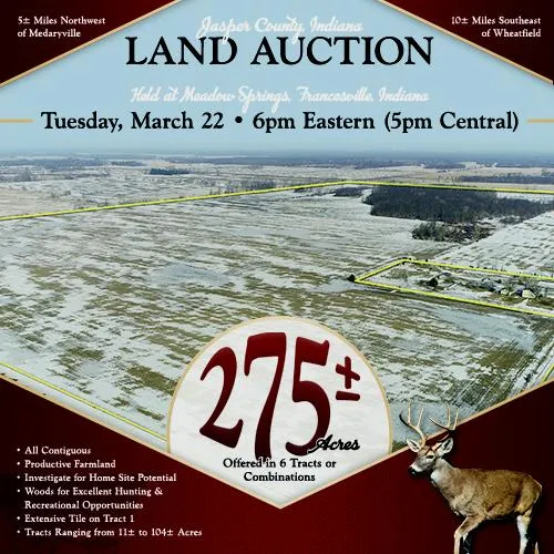 Tract 1: 104 ac Nearly all tillable productive farmland. Much of the southern portion of this tract has been systematically tiled over the past 3 years and a main extended north for future tiling if desired. Contact auction managers for a tile map. Frontage on CR 500 E.