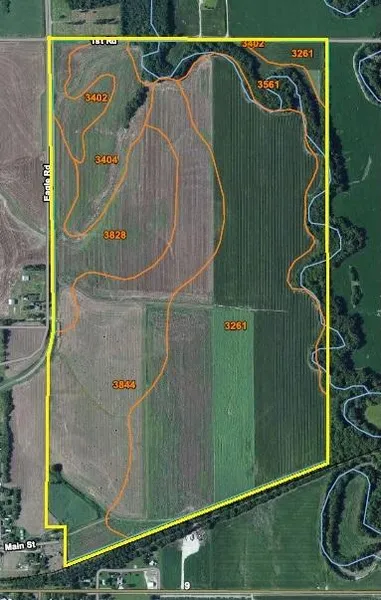 This farm, 275 acres, more or less, consists of approximately 250 acres cropland, with over one-half being bottom land and the rest of the cropland being gently sloping to moderately sloping upland. The bottom land is nearly all Class I Muir soils. The upland is a mix of Crete and Longford soils. The rest of the farm is waterways, timber, and a branch of Parsons Creek, which runs along the east property line. There are no growing crops.