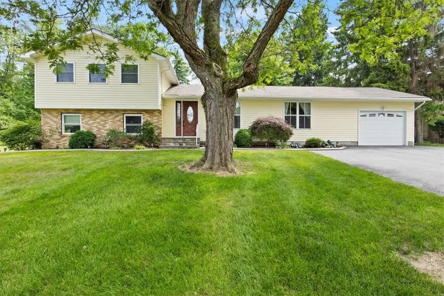 Amazing 2000 square feet completely updated home located near Canal Woods and Ridgeway Estates on a wooded one acre lot with Spencerport Schools. The designer kitchen is a dream come true with 42" cherry cabinetry, granite countertops, large island with option to heat the top, travertine floors with built in radiant heat, soft close drawers and stainless steel appliances. The great room features hickory hardwood floors, cathedral ceilings and a sliding glass door leading to the expansive stone patio. Large family room on the lower level has a fieldstone fireplace, wood floors, laundry room & full bath with access to private backyard. Some upgrades include: New hot water heater 2024, Renovated Upstairs Bath 2020, New driveway 2017, R-21 sidewall insulation, low e argon windows and premium vinyl siding, but the list goes on and on. House sits way back from road with attached garage, beautiful backyard with spacious patio, fire pit and re-built large shed for extra storage. MUST SEE! Delayed Showings - Monday, July 8th at 5 p.m. Delayed Negotiations - Sunday, July 14th at 6 p.m.