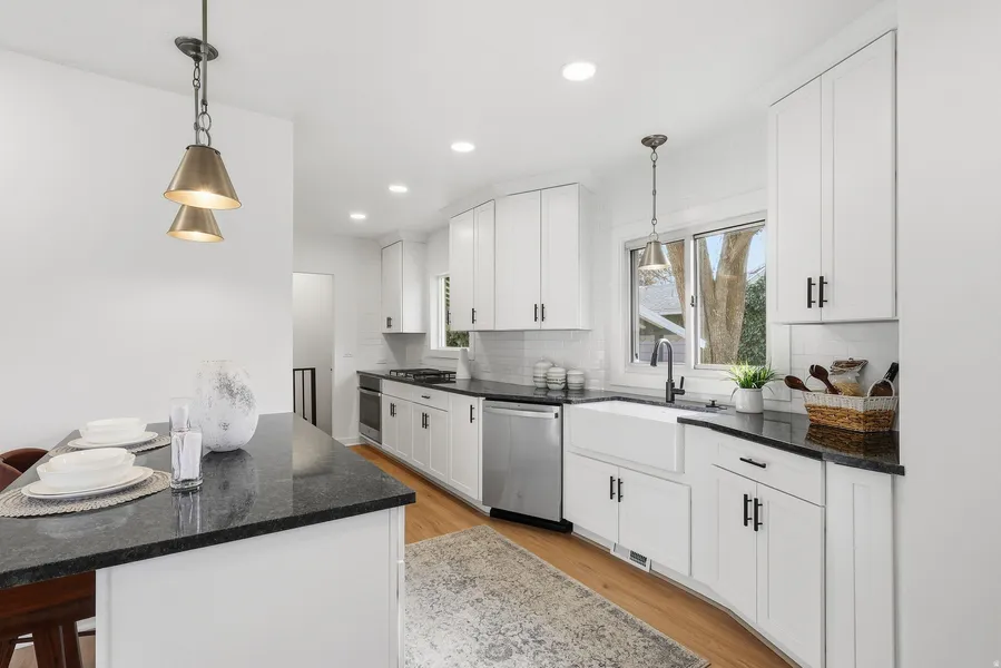 This beautifully restored Tudor home has been updated from top to bottom, featuring modern enhancements including new electrical, plumbing, cabinetry, flooring, and more. The main level boasts an open floor plan with a spacious and breathtaking kitchen equipped with a countertop stove and stainless steel appliances. Retreat to a huge master suite complete with a walk-in closet and an elegant bathroom featuring dual sinks. The lower level offers fresh carpeting, a laundry room, a bathroom, two bedrooms, and a cozy family room. Step outside to discover a private yard with a lovely garden and a large detached garage. Located in an unbeatable area with easy access to downtown, major freeways, dining, and entertainment, this home combines charm, comfort, and convenience.