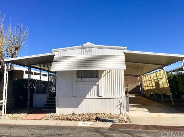 Great Buy! Cute 2 Bedroom 1 Bath manufactured home located in Sun City 55+ Mobile Home Gated Estates, with very low park fees of approx. $485 monthly. Home features 768 sq. ft., Open floor plan, good size living room, newer carpet, ceiling fans, Central forced Heating/air, Spacious kitchen with gas range, Formica counters, Breakfast nook, and pantry closet. Home enjoys One full bath between Bedrooms with single sink vanity, and easy to maintain fiberglass tub and shower. Just off Living room is large sliding glass door that leads out to oversized covered porch w/newer artificial turf- Is perfect place to relax, enjoy your early morning cup of coffee, and for outdoor entertaining! Home enjoys plenty of windows that allows the natural sunlight so home shows bright, and cheerful! Other features is large covered carport that will easily hold two cars, and 2 large storage sheds. Home is well maintained, and is super clean and affordable! Sun City estates community amenities include; Clubhouse, pool/spa, exercise room, Billiard room, Library and other social activities to choose from. Home is close to Freeways, shopping, and all major services. A must see!