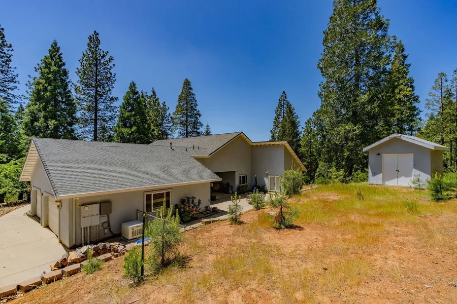 Welcome to an exquisite retreat on 2.45 acres of picturesque landscape, offering captivating forest views. Conveniently located near Highway 88, this haven is just moments from pristine lakes, rivers, and renowned wineries. Immerse yourself in the rich history of nearby Jackson and Sutter Creek, with their charming streets and storied pasts. Step inside to a sanctuary of sophistication, featuring soaring cathedral ceilings and an expansive great room with a majestic raised stone fireplace. Beveled glass front doors and picture windows invite natural light throughout. Entertain in the spacious formal dining room adjoining the great room. Wood floors add warmth to the kitchen and breakfast nook. The gourmet kitchen boasts Corian counters, stainless steel appliances, a generous island with a prep sink, double oven, 5-burner gas cooktop, and a walk-in pantry. Enjoy peace of mind with a Cummings generator for uninterrupted power. A deep 3-car garage with built-in storage ensures practicality. Outdoor living is elevated by a deck with serene views and a covered patio for al fresco entertaining. This exceptional residence features two wells for abundant water supply and a stucco finish with elastomeric paint for enduring elegance. Discover refined living in this meticulously crafted home, where every detail elevates your lifestyle.