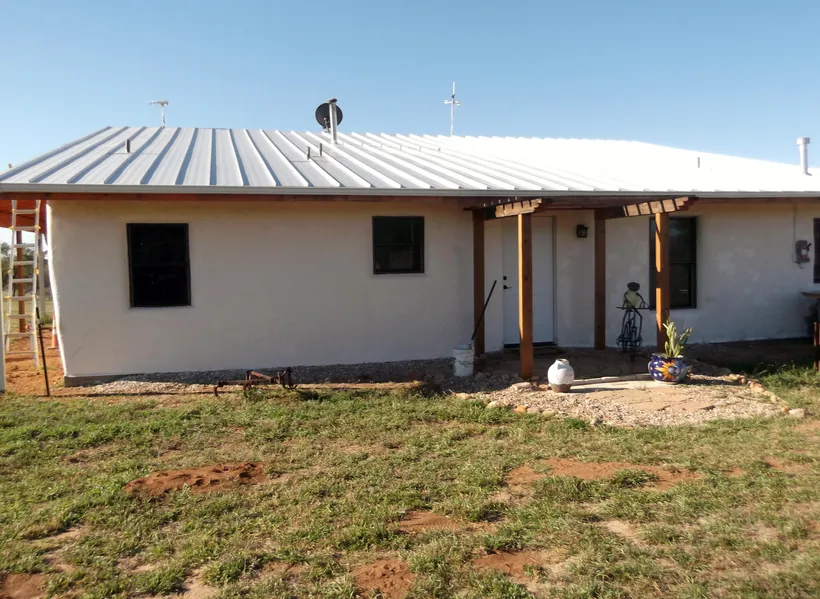 Lovely panoramic hill country views from this great (And Green!) 2 bedroom, 2 bath home on 28+ acres. The new owner of this unique place can really put their own finishing touches on it as they complete the final phase of construction. The rainwater distribution system provides plenty of water for the home and barn without a well! Groundwater in the area is decent if drilling a well is desired. Solar panels assist with electricity and the Passive Solar Straw Bale Posted Beam walls of the home make it super energy efficient and quiet. There is also a nice size, 1200 sq ft, fully insulated metal barn situated in the lovely native grasses. If you have considered building a nice home on a few acres but found the idea of construction from the ground up daunting, this is a must see. Currently very livable, but needs the final touches by You!