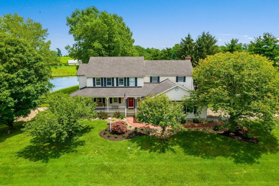 Picturesque Setting on over 12 Acres! Enjoy the view from the spacious front porch or relax by the firepit next to the pond. This spacious home offers 4 bedrooms, 4 full bathrooms and over 3,000 square feet of living space. Eat-In kitchen with custom cabinets, formal dining room, family room with brick-wall fireplace, walk-out lower level perfect for entertaining, spacious bedrooms, attached 2 car garage with an additional detached 3 car garage and workshop. Large Barn with 4 horse stalls at the back of property along with an area for a riding ring. Property has the potential to split off acreage.