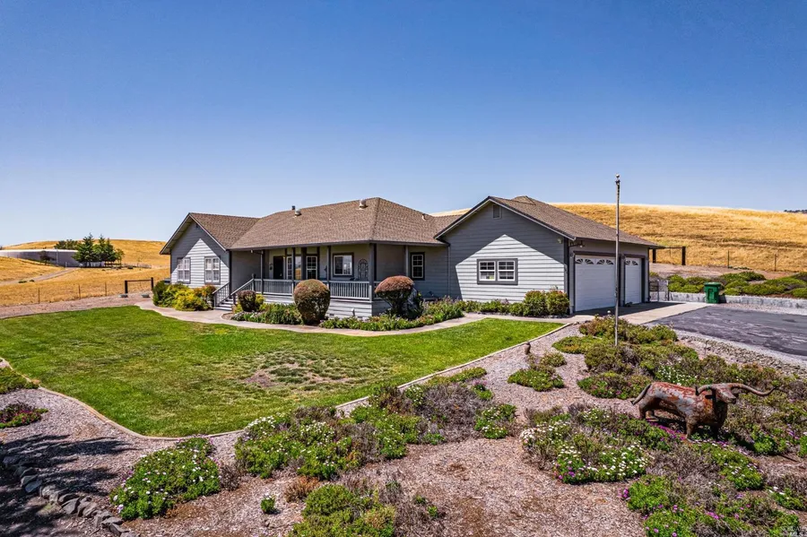 Custom built single story home, located just outside of town on over 79 acres with city water and PG&E utility provides a spacious front porch view of Petaluma and surrounding hills. 3 car garage, Cherry cabinets throughout kitchen and Cherry hardwood dining floor. Property is subject to Williamson Act. Numerous agricultural uses range from cattle to vineyard and more. Gentle to rolling sloped hillsides surround the home.