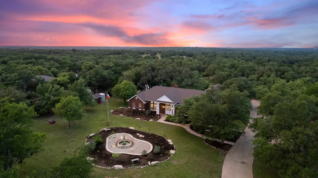 This storybook modern French country farmhouse is tucked away on a rare 5-acre parcel located on one-of-a-kind Logan Ranch Road. A custom-built automatic gate welcomes guests onto the property. The beautifully-designed and professionally-landscaped sanctuary is brimming with mature oaks, bluebonnets, and wildflowers surrounded by custom fencing that allows you to admire the deer and native wildlife around. The main home has a thoughtfully-designed one-story open floor plan. The home is light, bright, and well-appointed from the rich dark wood floors and new high-end carpet to the high ceilings and abundant windows. Inside the front door, a formal sitting area and dining room provide intimate gathering spaces for entertaining. The center of the home is a large airy kitchen with custom white cabinets and new appliances. The kitchen opens to a spacious living room with a French herringbone fireplace and custom shelving looking out onto the gardens, patio, and pool. A private primary suite and office are just beyond the living room with the other 3 bedrooms and guest bathrooms anchoring the other end of the home. The well-organized mudroom connects the residence to the garage. A stunning two-tier French country fountain serves as a focal point for the sprawling grounds, also home to a resort-style pool, a two-story kid’s playhouse and playscape, and an unfinished guest cottage. Bring your horses, goats, and chickens! There are three wells to provide ample water to the gardens and newly-planted orchards with 30 fruit trees. In addition, there are numerous raised beds, a chicken coop, a goat pen and barn, and a horse stable with cross fencing making this a homestead paradise. This property offers the best of Texas! Enjoy country living within 5 minutes of great dining and the local HEB in the heart of historic Georgetown and just 40 minutes to downtown Austin. This idyllic estate spares no detail and invites you to call it your home.