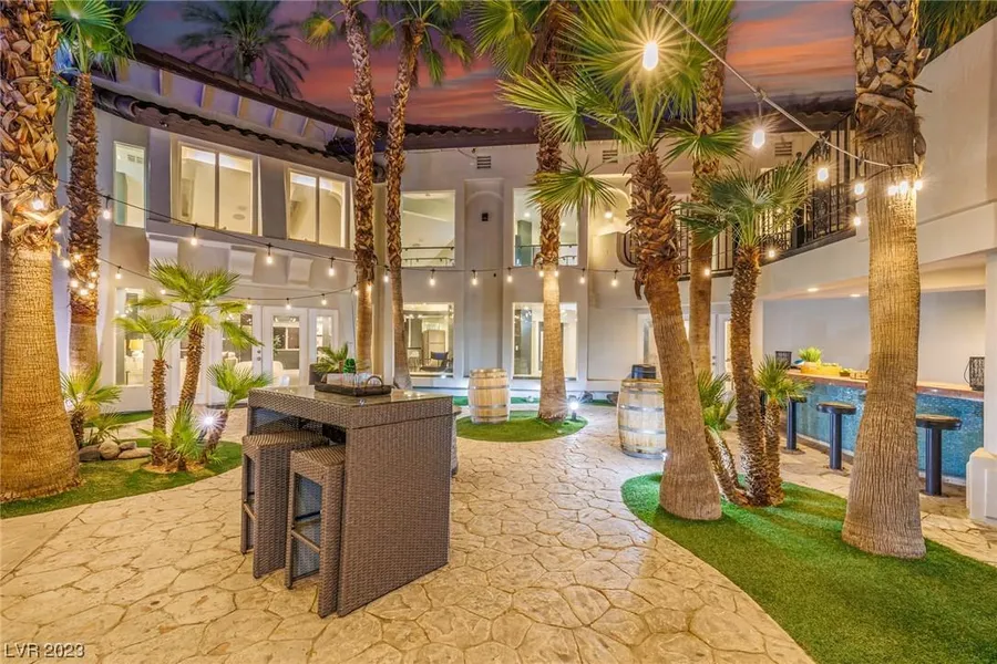 This exquisite Single Family Estate with No HOA offers an unparalleled living experience w/2 large ADU's. Situated minutes from Signature and Harry Reid Airports, LV Strip, and more. The fabulous pool area is a true oasis, featuring a Lazy River, Sand Beach Entry, 3 Spas, Mini Golf, Gazebo, Bridges, Waterslide, Cabanas, Swedish sauna and even a Grotto. App controlled water features. Over 2000 sq ft of patios and 3 verandas. The Main house exudes a Palm Springs vibe, with dramatic entry and a grand great room flooded with natural light, 2 way fireplace creates a cozy ambiance, while the full bar and ice maker make entertaining a breeze. The Open concept layout, kitchen boasting Viking appliances, marble countertops Marble and glass tiles add an elegant touch. Luxurious primary suit offers round bed, extra large jacuzzi bathtub and walk-through shower. Several Guest rooms plus 2 ADUs - one is the Game House and 1 is a 3 bed/ 1 bath house. Great Vacation Home or Corporate Rental