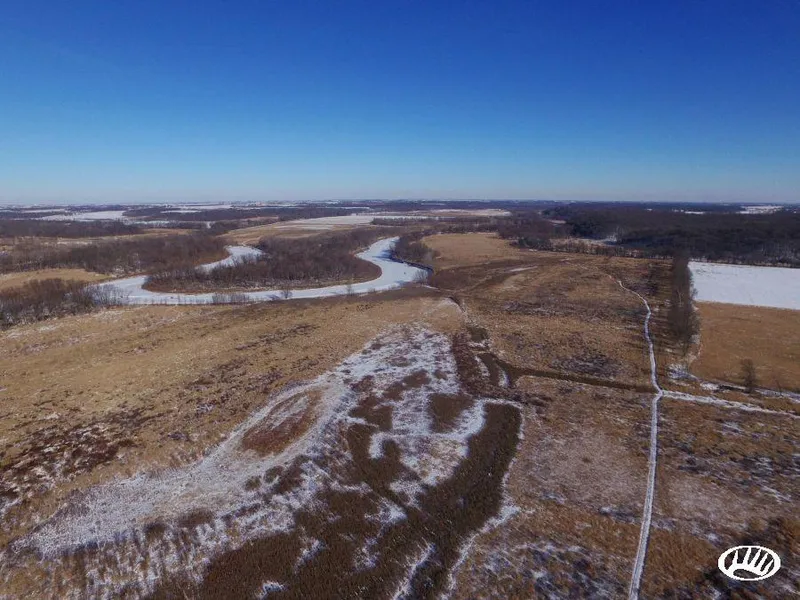 This stretch of native grasses, willow thickets, and timber pockets sits in the infamous Skunk River bottoms between Rubio, Brighton, and Lake Darling. 276 acres are enrolled in the Wetland Reserve Program (WRP), but three acres of higher ground not in WRP allows you to build a house or cabin. That’s huge, giving you the option to stay on premises unlike many other WRP tracts that don’t give you that option. Directly touching to the east is a massive network of hardwood ridges that connect to Brinton Timbers Park, a large no-hunting sanctuary. I sold a property just three miles down river, and big deer are no stranger to the area. Waterfowl, pheasants, and quail are also abundant in this wildlife haven. During the rut, this bottom habitat is the main highway for cruising bucks as they snake the river for a hot doe. This place is littered with rubs, so don’t let the aerial fool you with what looks like open areas. A whitetail doesn’t need any more than four feet of cover to vanish, and I’ve found they prefer wetland habitat just as much, if not more, over classic timber. Look at all of the trails sticking out in the snow! With strategic food plot locations, you could set yourself up for putting one of the local river monsters in target range. With plenty of timber pockets distributed throughout, you can hunt all over in traditional hang-on stands. There are three stretches of land across the river that you will own as well. This is a big advantage because you can slip into one of the peninsulas undetected with a canoe, and hunt a completely different herd of deer. Call me today for a private showing!