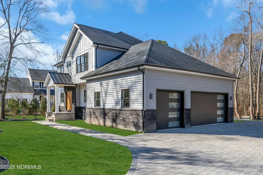 Prepare to be awestruck by this stunning new construction in Holmdel, showcasing impeccable craftsmanship and luxurious details. This custom home features a concrete porch with bluestone, a Belgium block paver driveway leading to a 3-car garage, and a modern, sleek design. Inside, you'll find nine-foot ceilings, a grand double-entry foyer, exquisite decorative molding, and solid oak flooring throughout. This home includes five bedrooms and three full baths, along with a state-of-the-art gourmet kitchen. The primary bedroom offers a free-standing tub, a luxurious walk-in shower, and a spacious closet/sitting area. The exterior is equally impressive, featuring a Timberline roof and a striking metal roof entrance, all set on a charming and private property. A great place to call home!